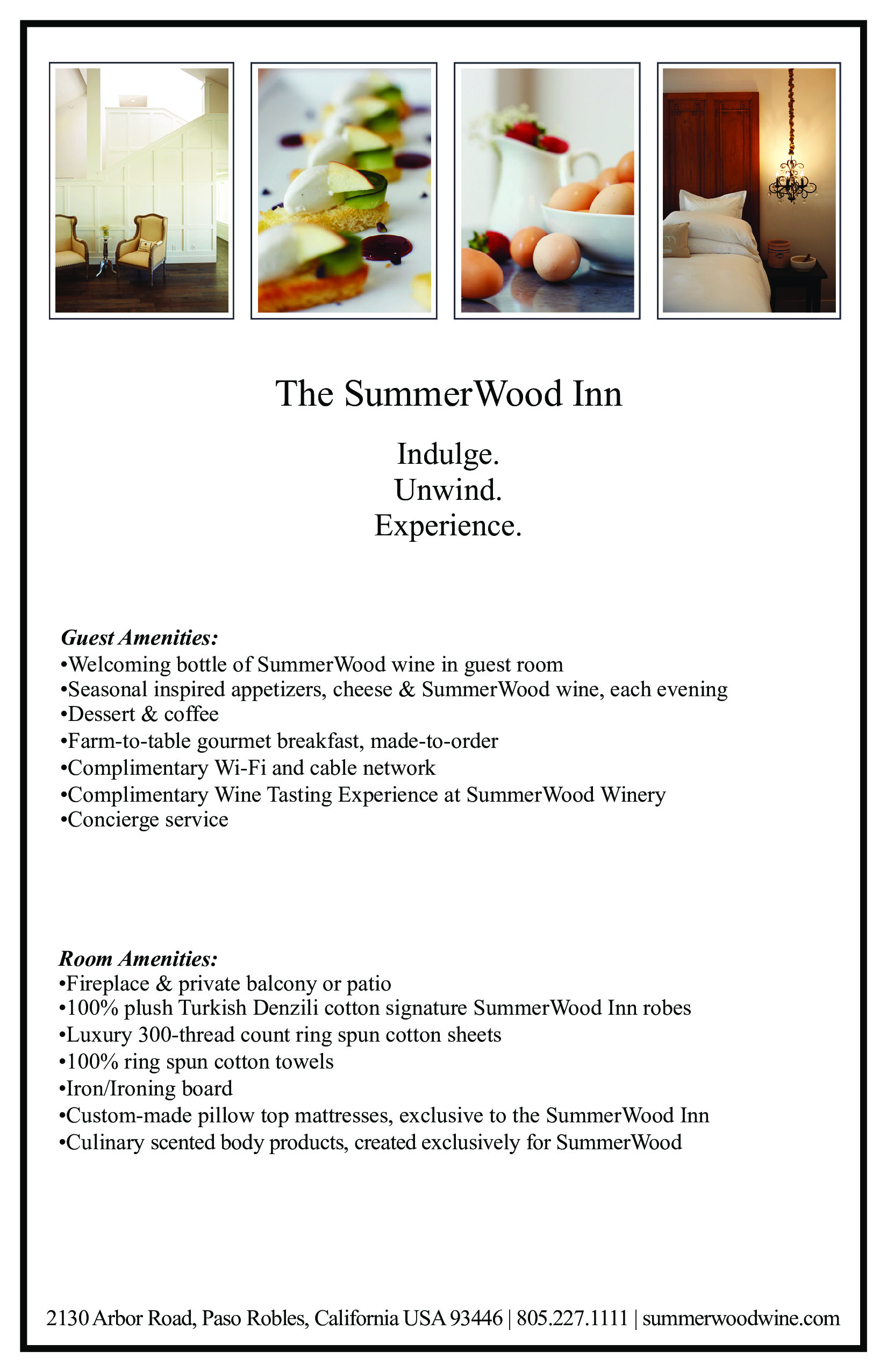 Our nine-room bed and breakfast Inn offers a welcome retreat amongst the vines and rolling hills of Paso Robles. A stay at Summerwood Inn includes a gourmet breakfast, wine and appetizer hour, nightly dessert and coffee, and a complimentary bottle of wine.